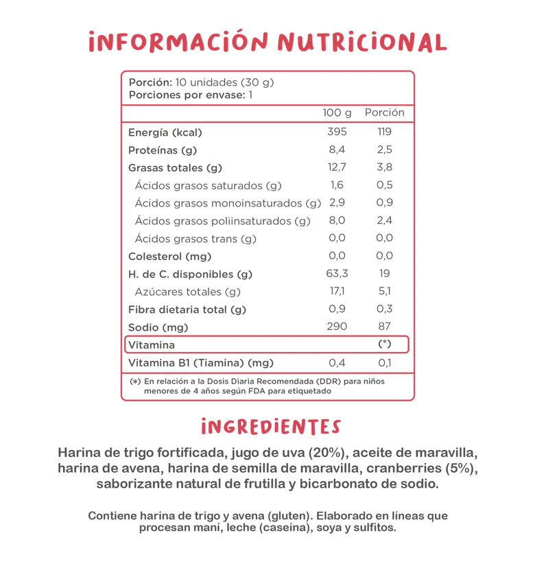 La opción ideal para un snack rico y nutritivo en cualquier momento del día. Nuestras galletas sabor frutilla están hechas con solo 8 ingredientes 100% naturales, sin azúcar, sin endulzantes y completamente libres de sellos.