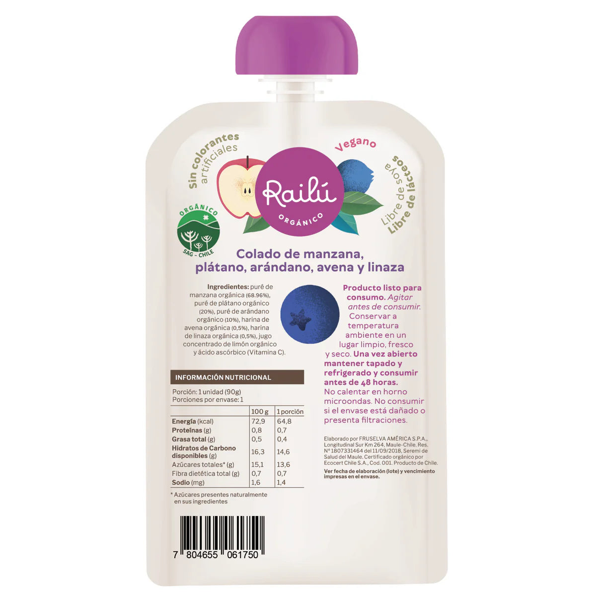Ingredientes: puré de manzana orgánica, puré de plátano orgánico, puré de arándano orgánico, harina de avena sin gluten orgánica, harina de linaza orgánica, jugo concentrado de limón orgánico y vitamina C.
