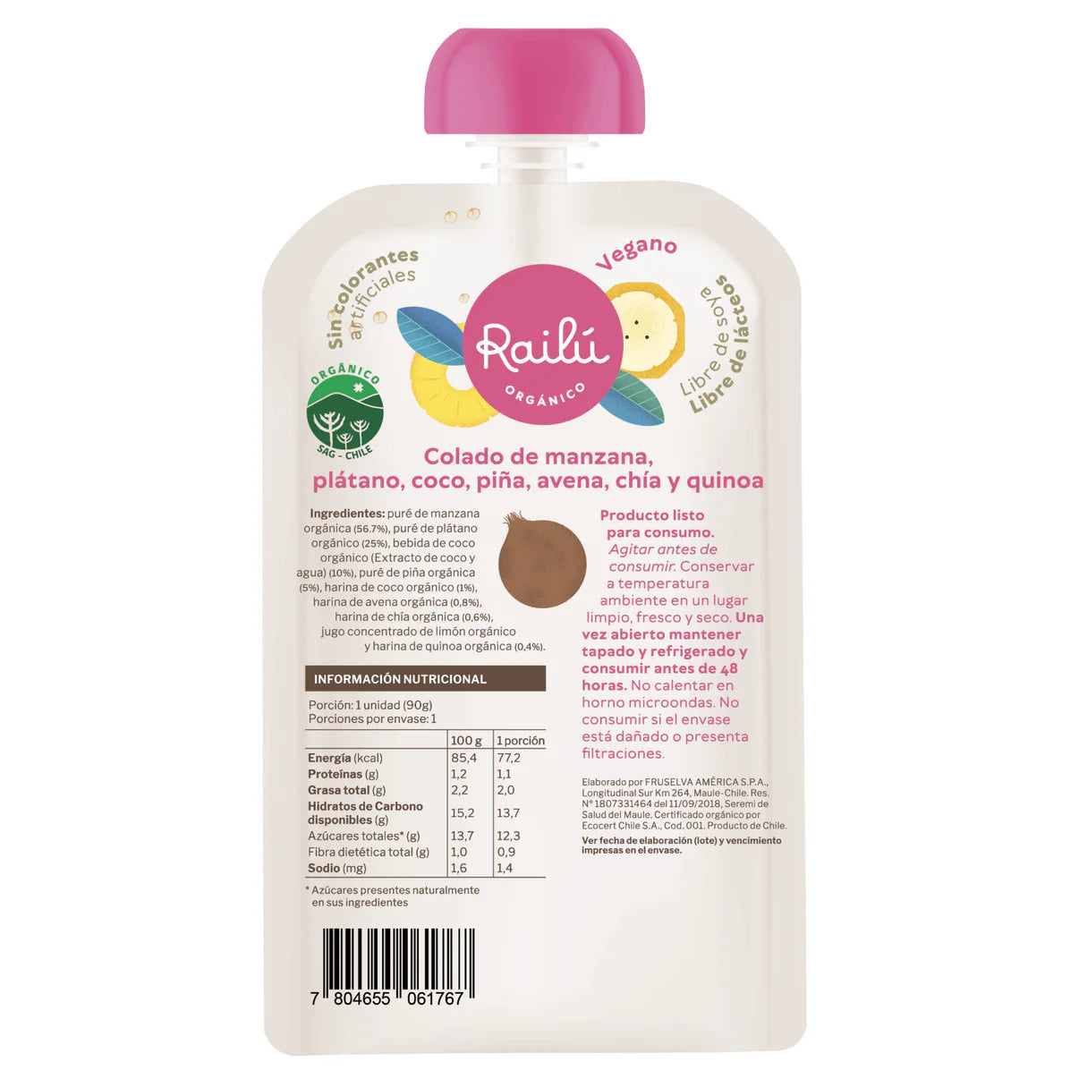 Ingredientes: puré de manzana orgánica, puré de plátano orgánico, bebida de coco orgánico (extracto de coco y agua), puré de piña orgánica, harina de coco orgánico, harina de avena sin gluten orgánica, harina de chía orgánica, jugo concentrado de limón orgánico y harina de quinoa orgánica.