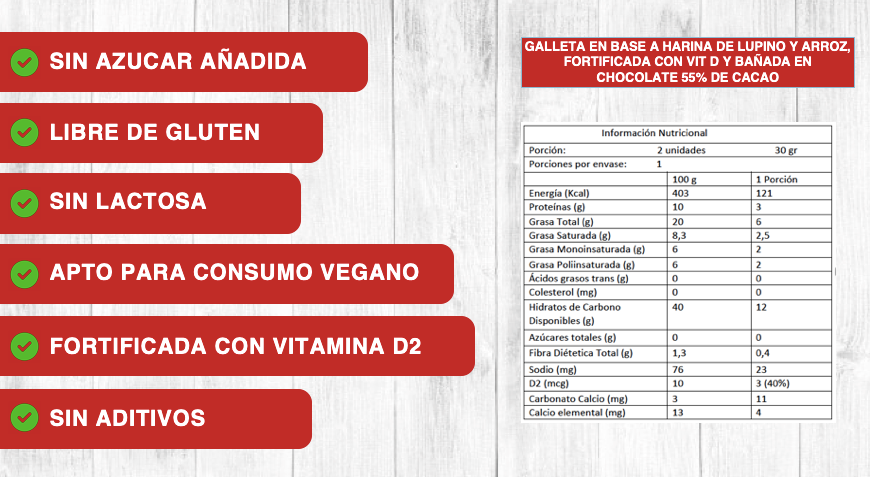 Dos galletas de vainilla fabricadas con harina de garbanzos y fortificada con vitamina D2. Bañada en chocolate con un 60% de cacao y relleno con pasta de dátiles suavizada con crema de coco.